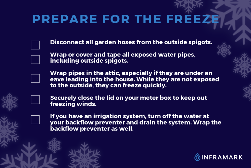 As a reminder from Winter Storm Uri, Senate Bill 3 was passed in 2021 which prevents penalties and water service terminations during an “extreme weather emergency.” This is defined as a period when the previous day’s highest temperature and the predicted temperature for the next 24 hours are both no higher than 28°F.